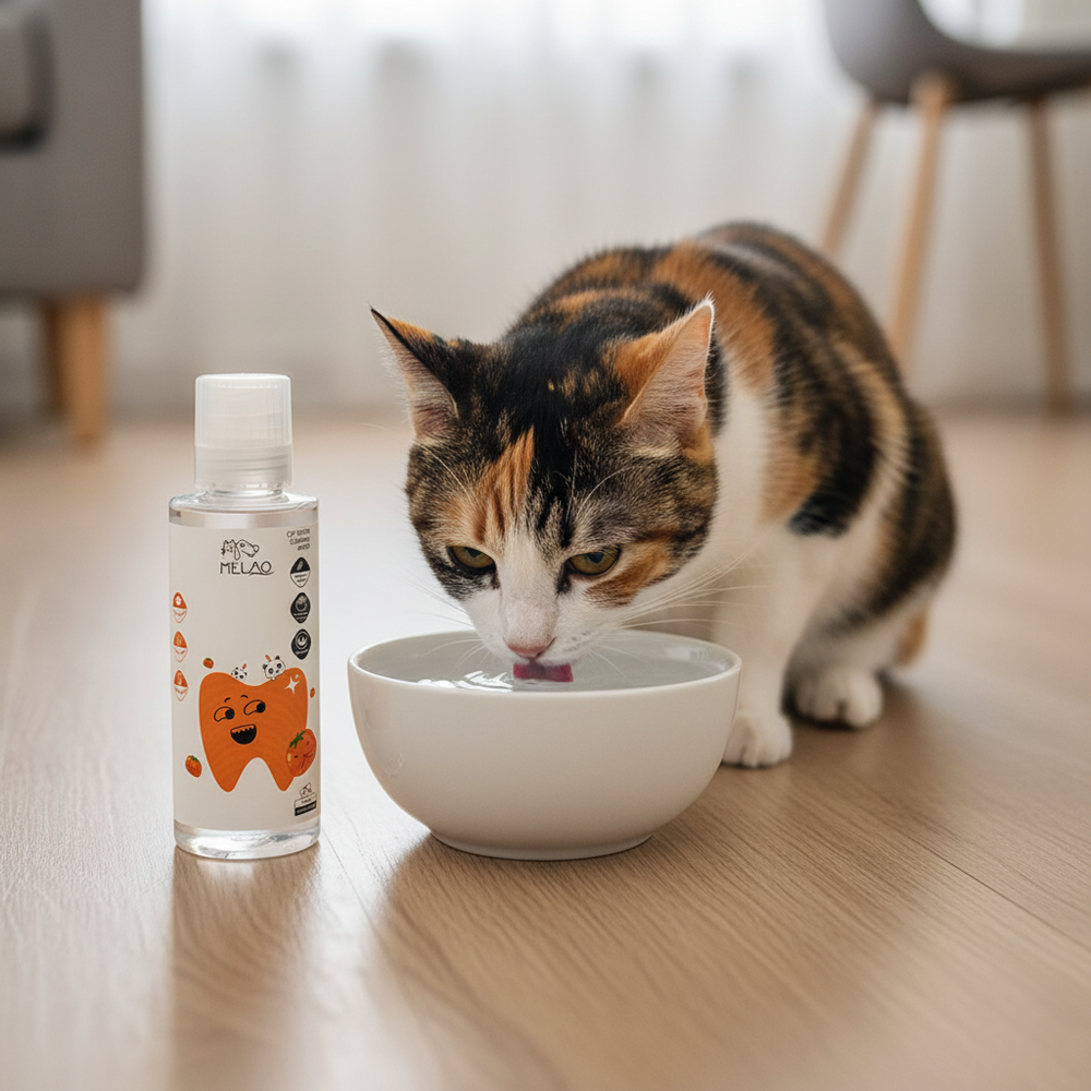 Melao Pet is safe to use in water fountains. It’s tasteless and won’t affect water flow or filters, so your cat can keep drinking normally while getting daily dental support.